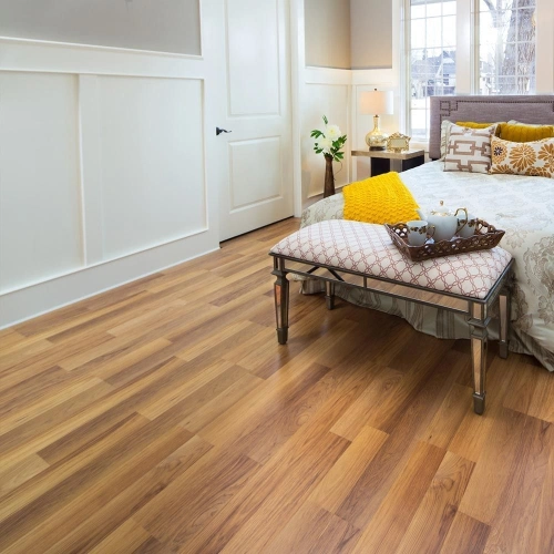 PVC flooring resists water and moisture, making it ideal for humid conditions and areas like kitchens, bathrooms, and laundry rooms.