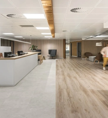 This flooring features high-end embossed-in-register (EIR) textures, best for formal home decors, receptions, workspaces and offices.